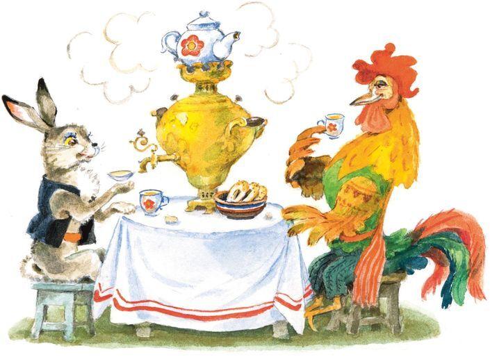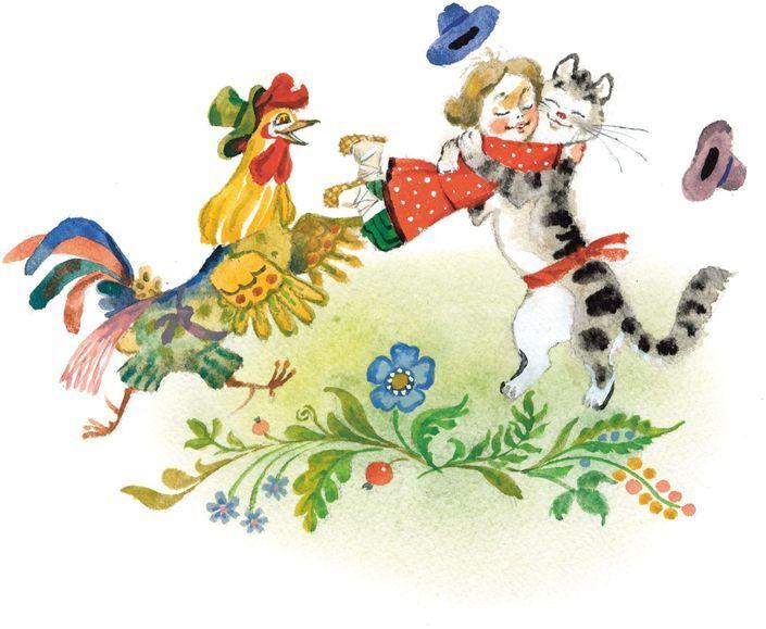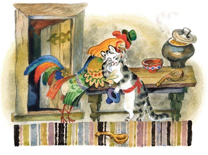 Обрадовались кот да петух, стали Жихарку обнимать-целовать, за стол сажать.