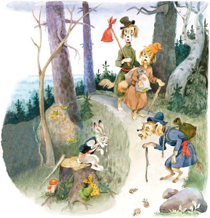 Пошёл зайка со двора, сел под берёзкой и плачет. Бегут мимо собаки, видят – зайка плачет. Спрашивают его: