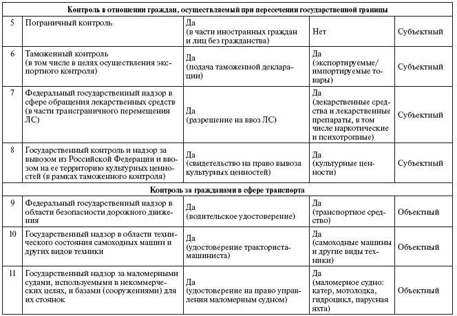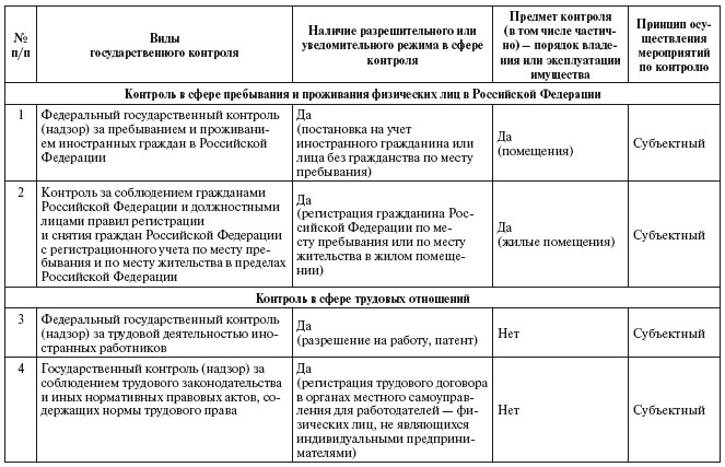 В табл. 1 и 2 приведена классификация и перечислены виды государственного контроля в отношении граждан. В табл. 1 приведен исчерпывающей перечень общехозяйственных (полисубъектных) видов государственного контроля, а в табл. 2 – исчерпывающий перечень специфических видов государственного контроля, осуществляемых только в отношении граждан.