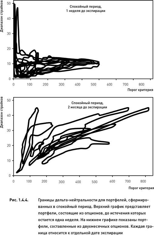 Верхний график на рис. 1.4.4 представляет 12 границ дельта нейтральности, относящихся к портфелям, составленным в спокойный период из опционов с ближайшей датой истечения. Хотя границы не совпадают между собой (что вполне естественно, поскольку все они относятся к разным датам экспирации), тем не менее общая картина достаточно ясна и позволяет сделать несколько важных выводов. Во-первых, все границы располагаются приблизительно в одной области. Во-вторых, почти все границы имеют схожую форму, более или менее вытянутую в сторону высоких значений порога критерия. В-третьих, большинство границ располагаются в зоне достаточного узкого диапазона страйков (хотя в некоторых случаях имеются «отростки» границ в сторону более широких диапазонов). Такая форма границ указывает на то, что в период спокойного рынка соблюдение условия дельта-нейтральности для портфелей, состоящих из опционов с близкой экспирацией, возможно в довольно широком диапазоне порога критерия, но требует использования достаточного узкого диапазона страйков.