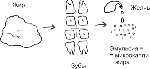 Желчь тоже отмывает жиры. Она, кстати, даже по цвету похожа на фэйри, золотисто-зеленая за счет содержания в ней билирубина. Когда из желудка кусочек жирной пищи уже мягкой консистенции попадает в двенадцатиперстную кишку, на него падает капелька желчи и случается чудо омыления. Так же как в рекламе капля фэйри растворяет жир на тарелке, и он отступает в разные стороны. На самом деле не отступает, а растворяется и превращается в микроскопические капли. Вот их-то и могут переварить ферменты поджелудочной железы. Крупные куски жира им, конечно, не по зубам. Но об этом речь пойдет дальше, в главе о поджелудочной железе.