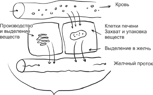 Несмотря на мощность и резервы поджелудочной, она не может переваривать крупные куски или капли жиров. Их нужно разбить на микроскопические – именно это и делает желчь. Она производится в печени, с ней происходят определенные превращения, и она доставляется по протокам в кишечник. Вместе с ней заодно выносится из печени то, что печени не нужно: лишний холестерин, фосфолипиды, билирубин и токсичные желчные кислоты. Обо всем этом речь пойдет в следующих главах.
