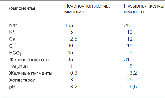 Исходная желчь по составу электролитов или минеральных веществ мало чем отличается от сыворотки крови, разница только в самих желчных кислотах, холестерине и билирубине. За счет того, что в клетки желчевыводящих путей встроены натрий-калиевые насосы, они изменяют баланс электролитов и превращают слабощелочную желчь в почти нейтральную. Точный состав смотрите в таблице.