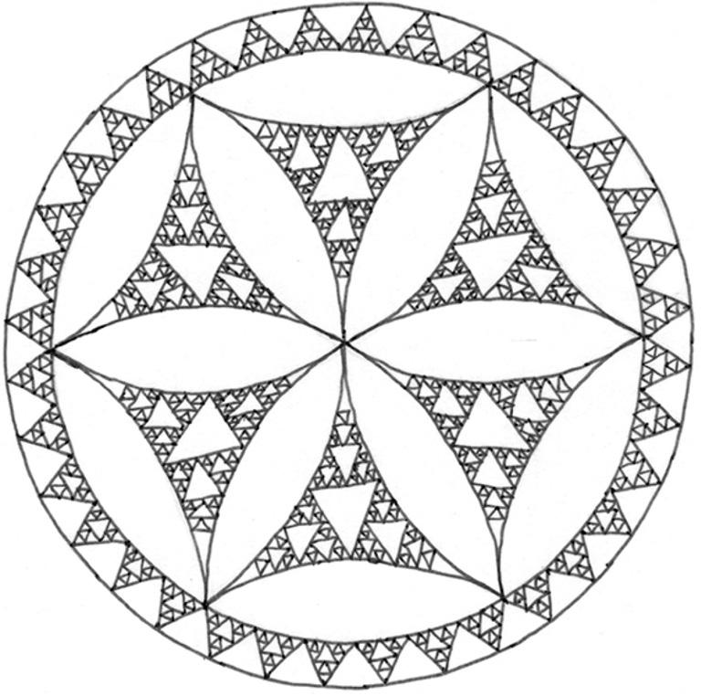 Круглый узор под треугольником на рисунке слева — это плиточный орнамент XIII века в одном из итальянских соборов, представляющий собой шесть фигур, напоминающих изогнутые треугольники Серпинского, окруженные кольцом треугольников поменьше [3]. (Делая данный набросок, я измерил и зарисовал основные элементы, а остальное заполнил на глаз. Это заняло немало времени. Но оригинал вырезался вручную, элемент за элементом, а потом они складывались вместе. Когда я об этом думаю, тот час, что я провел над рисунком, уже не кажется таким долгим.)
