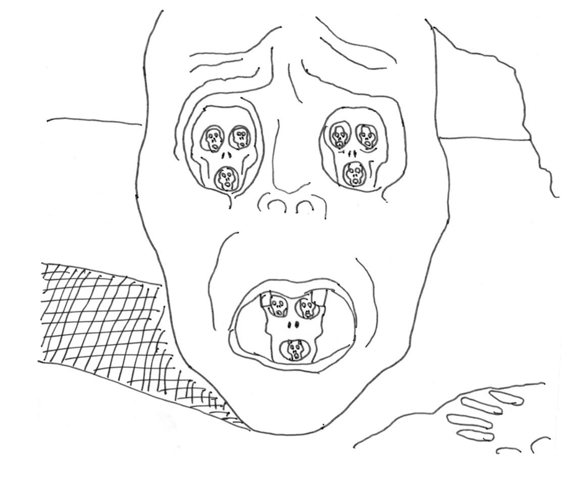 Более свежим примером использования самоподобия является картина Дали «Лицо войны» (1940), изображающая бесчисленные ужасы гражданской войны в Испании. На картине мы видим лицо, в глазницах которого и во рту заключены другие лица, в чьих глазницах и ртах снова заключены лица, и так далее еще на несколько уровней вглубь. Паттерн очень напоминает треугольник Серпинского — повторение фигур, выстроенных в треугольник, только в данном случае располагающихся наверху слева и справа и внизу посредине. Картина Дали гораздо страшнее, чем мой набросок: по обеим сторонам головы без тела вьются клубки змей [4].