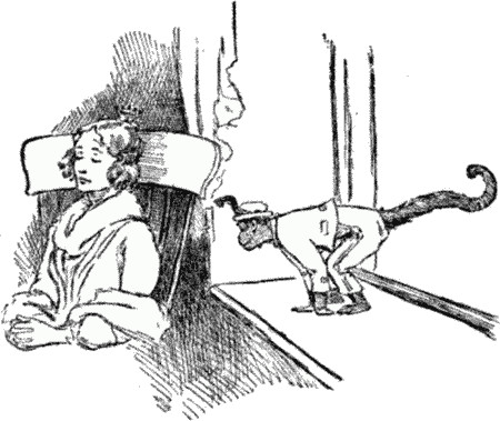 The brakeman and conductor came running in to see what was the matter. Nobody knew why the train had stopped. It was several minutes before they discovered the cause, but I had found out while Stuart was climbing back to bed with me. Swinging by her hands from the bell-rope which ran down the centre of the car, was that miserable little monkey, Matches, making a fool of herself and everybody else. Who but that little imp of mischief would have done such a thing as to get up in the middle of the night and go through a lot of gymnastic exercises on the bell-rope? It was her swinging and jerking on the rope that rang the bell and brought the engine to that sudden stop.