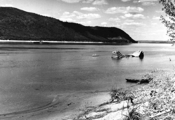 Поселок назван Управленческий, т.к. предполагалось, что в нем будет расположено управление строительством Куйбышевской ГЭС. Один из корпусов завода был построен изогнутым, так, чтобы воспроизвести часть русла Волги для проведения в этом корпусе гидравлических испытаний, на мой взгляд, он имитировал русло от Жигулевских ворот до Студеного оврага. По довоенному проекту Волгу собирались перекрыть у Красной Глинки. К Красной Глинке подвели железную дорогу и для сооружения гидростанции начали строить завод «Электрощит». Под гигантскую высоковольтную мачту для передачи электроэнергии при строительстве ГЭС, с одного берега на другой, до войны успели соорудить громадные железобетонные опоры с торчащими из них крепежными болтами. За время войны их подмыло. При нас одна из них торчала одним краем из воды рядом с Красноглинским пляжем и за несколько лет совсем ушла под воду, бесследно замывшись песком. На снимке видны две опоры.