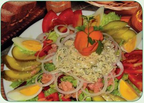 Рыбу размять вилкой и выло-жить в центр тарелки на листья салата, сверху выложить лук и капусту. По краям разложить огурцы, помидоры и яйца.