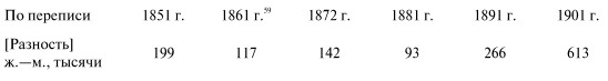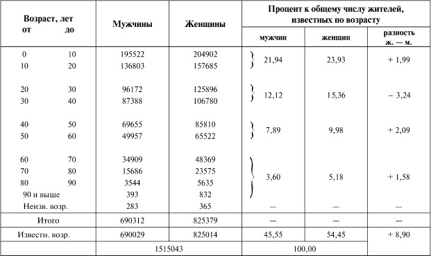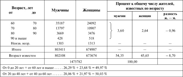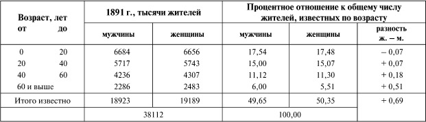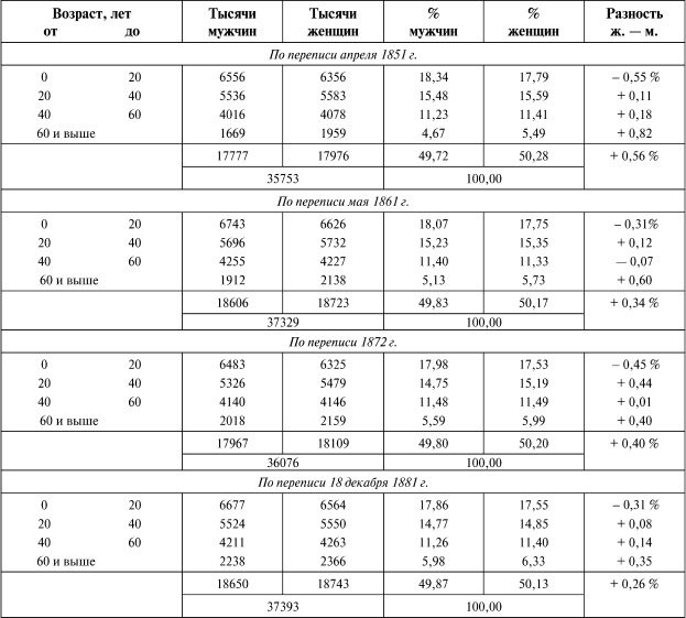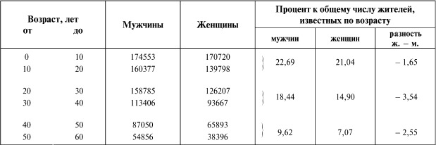 Эти самые лица при переписи 1891 г. имели возраст от 20 до 40 лет, и их тогда оказалось: мужского пола 5717 тыс. и женского пола 5743 тыс., т. е. из 100 чел. выжило 88,2 % мужчин и 90,8 % женщин, т. е. женщин в протекшие годы выбывало гораздо менее, чем мужчин.