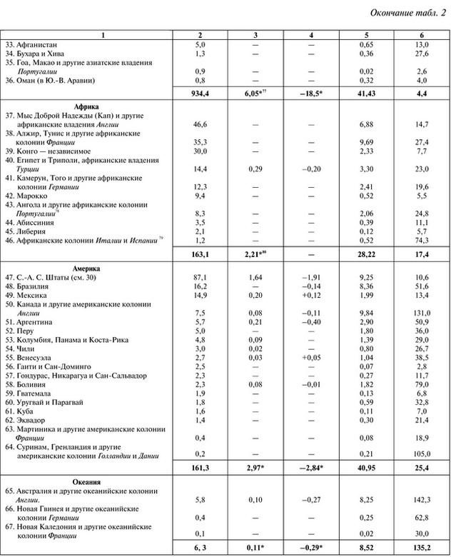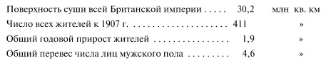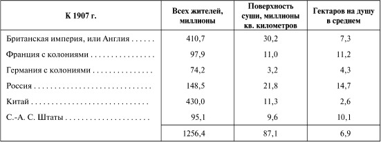 Эти данные (D, А, В и С) внесены в табл. 1, которая показывает по сравнению с целыми государственными владениями Англии и Франции, что Россия как по величине поверхности, так и по числу жителей занимает средину между двумя упомянутыми государствами, Германия же в обоих отношениях слабее каждого из них. Хотя в России на жителя (14,7 га) земли приходится в среднем гораздо более, чем в английских владениях (7,1 га) и даже французских (11,2 га), но не должно забывать, что в России около трети земли, находясь около Ледовитого океана, бесполезно в отношении к земледелию, составляющему преобладающий промысел России, а в тропических странах, где имеются колонии — а потому и запасы на будущее — не только у Англии и Франции, но и у Германии, у России нет никаких следов или даже попыток занятой земли. Зато у России есть такая сплошная непрерывность занятой ею суши, какой нет ни у одной из трех западноевропейских мировых держав.
