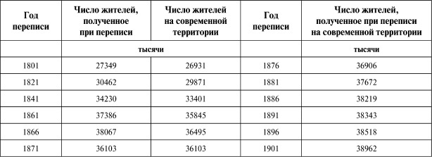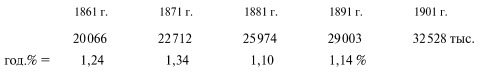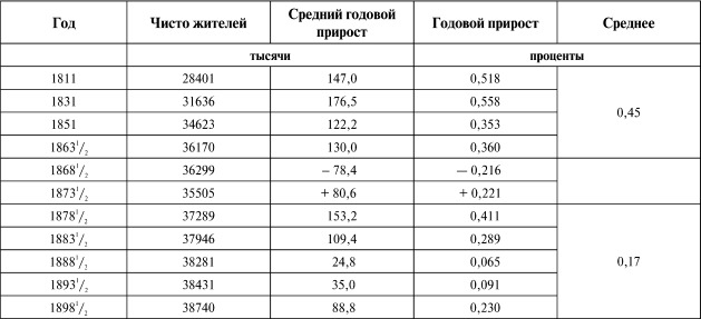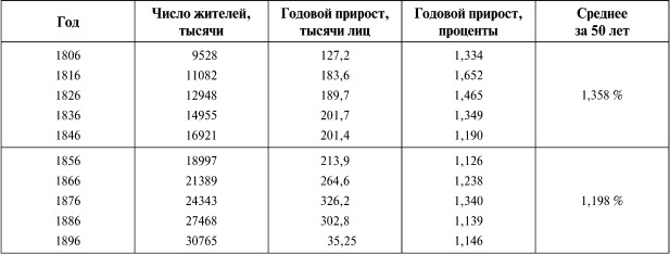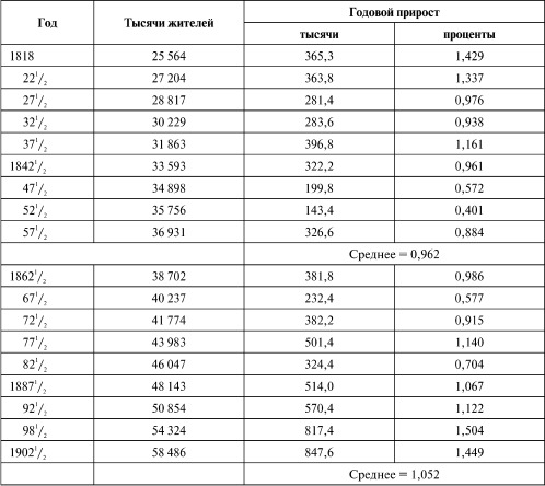 В 100 лет население возросло, значит, в 3,66 раза, что дает общий средний процент годового прироста, близкий к 1,25. Для того же, чтобы проследить изменения годового прироста в XIX в., берем средние года, для них принимаем среднее число жителей и к ним относим как абсолютный, так и процентный годовой прирост.49