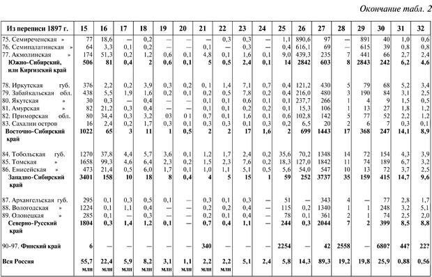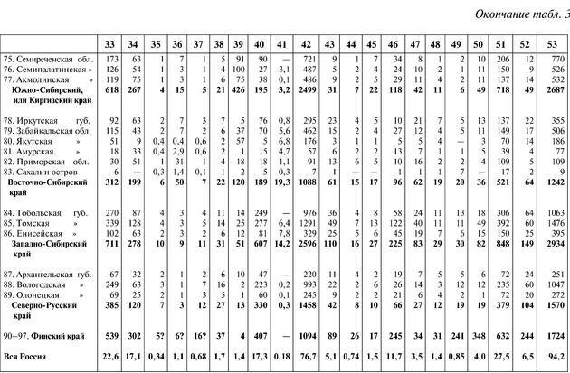 Но из других сопоставлений становится очевидным, что главное влияние оказывает состав населения и род его занятий. Там, где преобладает чисто русское население и оседлый сельскохозяйственный образ жизни, как и в Европейской России, число женщин преобладает, например: