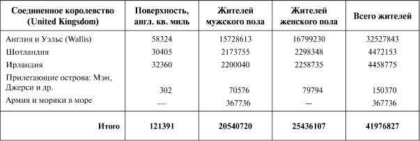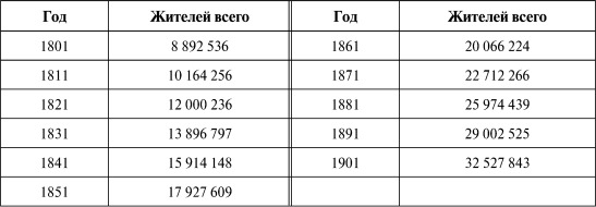 Для Англии (с Уэльсом) известны приводимые вслед за сим данные о числе всех жителей для одиннадцати переписей с начала XIX в. Не надо забывать, что в это время эмиграция (выселение) много превосходила иммиграцию (переселение) в Англии, т. е. естественный прирост, или перевес рождений над смертями, был больше того «действительного» прироста, какой выходит из данных переписей.