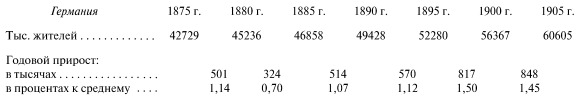 Из крайних данных (для 1816 и 1905 гг.) выводится общий средний годовой процент прироста = 0,94 %. Хотя современный прирост для Германии гораздо более, чем для Англии, но за все столетие средний английский прирост (1,25 %) более немецкого55, а это дает уже явный намек на прибыль прироста, что и составляет главный интерес данных о народонаселении Германии, которые мы разочтем как предшествующие: