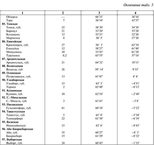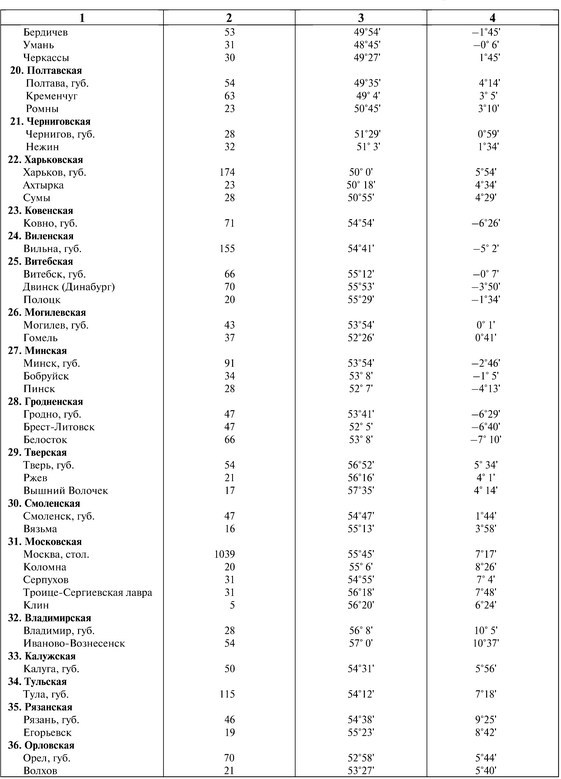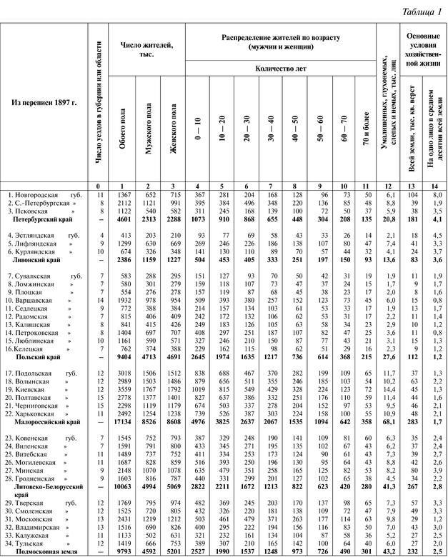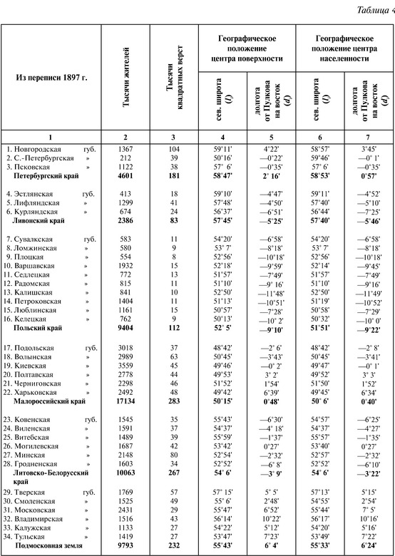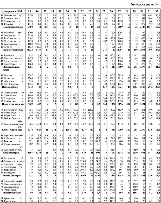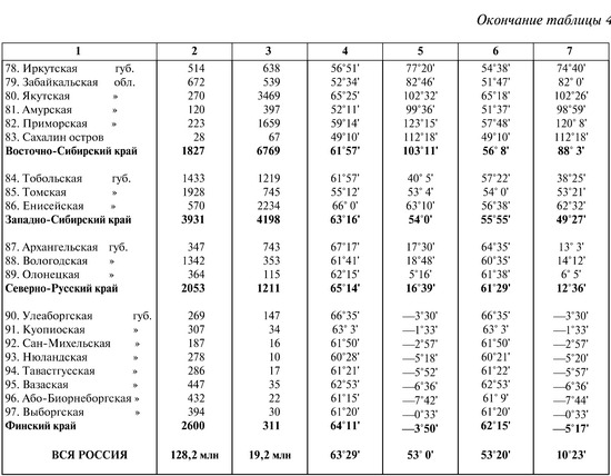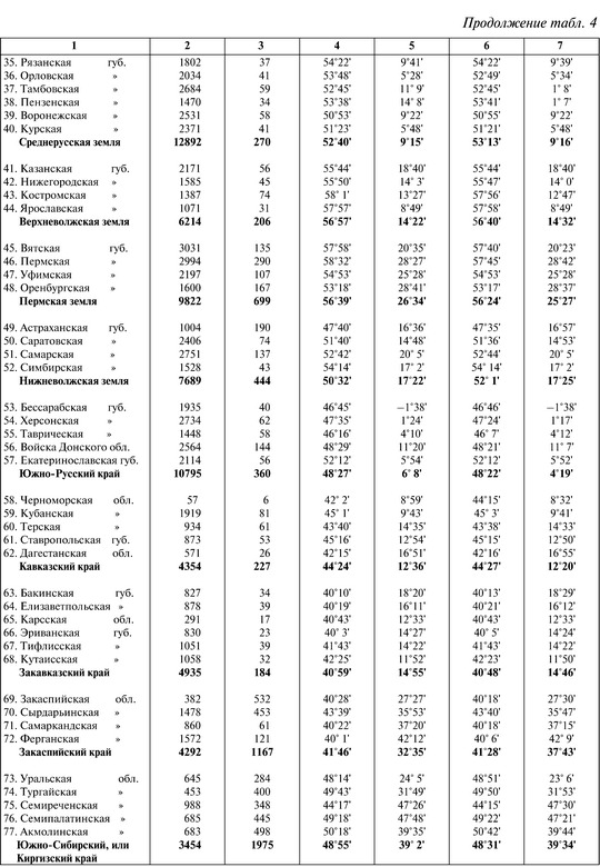 Остановим внимание на некоторых числах, заметив предварительно, что для важнейших данных (число жителей, вся поверхность и число гектаров на душу) степень точности достигается, вероятно, до 1 %, но только потому, что каждое из приведенных чисел представляет сумму многих; в отдельных же слагаемых погрешности могут быть очень значительными.43 Наибольшую достоверность имеют, конечно, цифры двух последних столбцов. Числа же годового прироста и разности мужчин и женщин, особенно последние, представляют наименьшую достоверность и приведены лишь как первое приближение, по тому интересу, который, содержится в сведениях этих обоих родов.