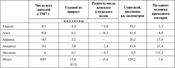 Такие громадные материки, как Африка, Америка и Австралия, поныне населены, сравнительно с Азией, очень слабо, а столетия за два, когда их мало знали и они были предоставлены своим силам и течениям жизни, число в них жителей, по всей вероятности, говоря вообще, было если не меньше, то уже никак не больше современного, хотя местами и были скопления, властвовавшие над всем соседним. Главною причиною малой населенности названных континентов, богатых дарами природы, служили, без сомнения, войны, везде господствовавшие, и ими вызванный деспотизм, по сравнению с которым европейский или азиатский деспотизм может быть назван благодетельным. Этим я не желаю обелить ни жадных испанцев, беспощадно истреблявших южноамериканские и другие народы, ни английских приемов истребления маори или североамериканских индейцев, ни истребления негров арабскими народами, а желаю только выяснить ту мысль, что роль европейцев в Африке, Америке и Австралии, несомненно, послужила к смягчению нравов и даже к увеличению числа жителей, если не во все время последних двух столетий, то, по крайней мере, за последние десятилетия XIX ст., и надо полагать, что так будет и впредь что должно послужить к быстрому росту числа жителей, особенно в Америке и Австралии, где при современной мере годового прироста (около 1,75 %) удваивание числа жителей должно совершаться примерно в 40 лет. А так как при годовом приросте в 6 млн на 934 млн, как в Азии, удваивание произойдет лишь в 120 лет, тогда лет чрез 150 Америка должна быть столь же тесно заселена, как и Азия. Для мальтусов тогда должны начаться гибель человечества и общие бедствия от недостатка продовольственных средств, но для современных мыслителей и наблюдателей— одним из каких стараюсь быть сам и каких желаю более всего видеть как в русской среде, так и всюду — увеличение числа жителей в Европе и Азии в 4 раза, а в Африке, Америке и Австралии раз в 10 или 12, т. е. население всей Земли 10 тыс. млн (10 млрд) людей: а) ничуть не страшно, б) обещает только хорошие результаты и в) не только возможно лет чрез 250–300, но и желательно, что я и постараюсь показать и доказать, хотя со всею возможною краткостью.