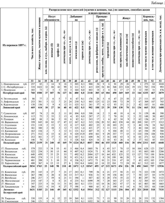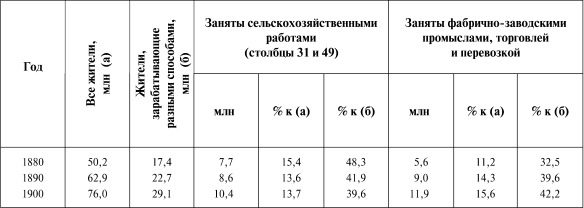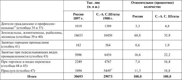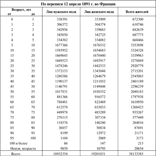 Сперва приведем в более полном виде данные из переписи, произведенной во Франции в 1891 г., чтобы показать сложность основных данных и дать возможность видеть происхождение тех сокращенных таблиц, какие мы далее применяем для лучшей обозрительности и для сокращения размеров исходных данных: