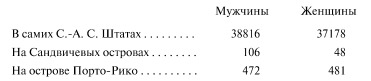 Для Аляски чисел нет, но ее население так незначительно (64 тыс.), что для него можно принять общее среднее отношение, которое дает на 39 394 тыс. лиц мужского пола 37 707 тыс. женского, т. е. С = –2,188 %, а отсюда к 1907 г. С = –1906 тыс.