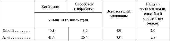 Обращаясь к последнему столбцу табл. 2, прежде всего считаю полезным заметить, что тот порядок, в котором мы привыкли перечислять страны света, начиная с Европы и кончая Австралией, не отвечает последовательности ни по числу жителей, ни по величине поверхности, но вполне отвечает последовательности как по густоте населенности, так и по времени начала тесных сближений со всем светом. В Европе теснее всех стран и на душу приходится лишь 2,3 гектара всей земли, включая и норвежские или мурманские тундры, в Австралии же — до 135 гектаров на душу. Отсюда очевиден уже переселенческий напор европейцев преимущественно на Америку и Африку, азиатов — на Австралию, Америку и Африку. Разность тесноты в Европе и Азии не столь велика, как показывают количества (2,3 и 4,4 гектара на душу) всей земли, приходящейся на жителя, потому что земель, к обработке неспособных, в Азии пропорционально больше, чем в Европе. В ней северные тундры, песчаные степи и горные вершины, надолго непригодные ни для какой хлебной культуры, едва ли занимают более 1,5 млн км, в Азии же (считая и Зондские острова) поверхность суши, ими занятой, не менее 15 млн кв. км. Если принять эти (лишь приближенные) числа, то окажется: