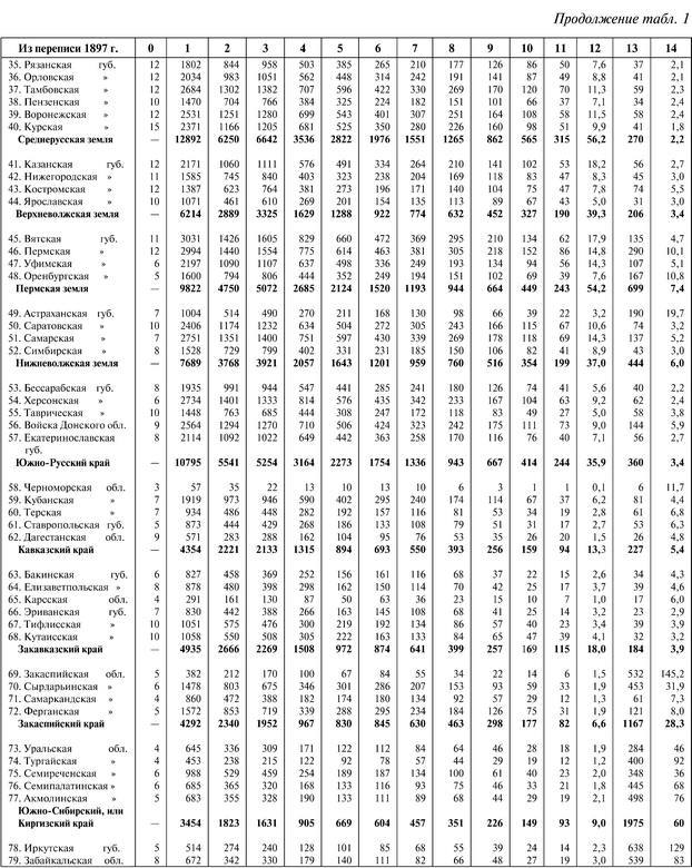 По переписи 1897 г. в Сырдарьинской области оказалось следующее распределение почти 1,5 млн (точнее 1478 тыс., а известных по возрасту 1476 тыс.) жителей: