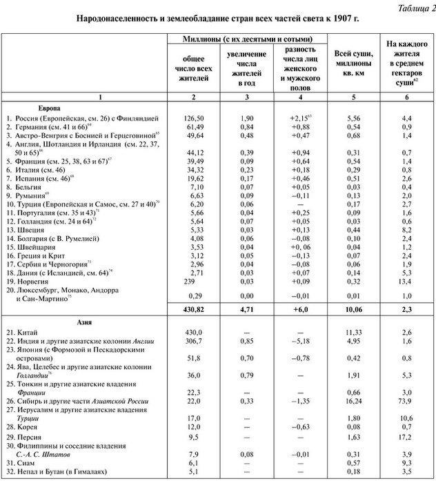 Окончу свои общие замечания, относящиеся к шести важнейшим мировым державам, указанием на то, что Китай, явно просыпающийся от своей вековой спячки, наглядно выраженной в курении опия, имеет наибольшее число жителей и наименьшее количество земли, приходящейся на душу, а потому, принимая во внимание быстрые успехи Японии35 и возможность сближения интересов Китая и Японии, заслуживает первостепенного внимания, особенно со стороны России, Франции и Англии, которым его враждебность может быть очень вредна. На основании древних дружественных отношений к Китаю Россия может с большим, чем какая иная держава, основанием вступить в союз с Китаем, которому русское посредничество может многое облегчить и обезопасить от давления других европейцев первые шаги несомненных будущих успехов, обеспечиваемых талантливостью, трудолюбием и многолюдьем китайского народа. […] Ознакомившись в табл. 1 с главнейшими данными о народонаселении наиболее сильных мировых держав, перейдем теперь к таким же данным для всего света (табл. 2), чтобы еще яснее уразуметь то особое во многих отношениях срединное положение, которое принадлежит нашему отечеству.