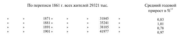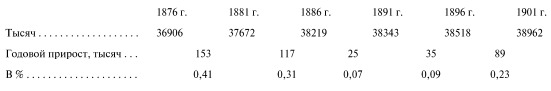Для расчета брал лишь цифры, относящиеся к современным размерам Франции. Крайние цифры (26 931 и 38 962 тыс. для 1801 и 1901 гг.) дают общий средний годовой прирост в 0,365 %, т. е. почти в 3,5 раза меньший, чем для Англии.