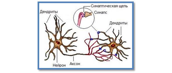 Дендрит левого нейрона получает электрический импульс, который проходит через тело, через длинный отросток аксон и передается дендритам другого нейрона. В том месте, где идет соединение, смотрим, на картинке выделено кружочками, там нет физического контакта, там щель.