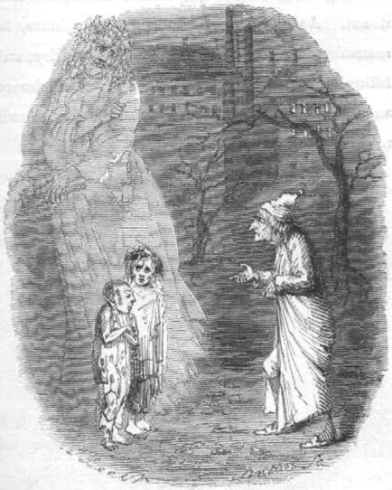 From the foldings of its robe, it brought two children; wretched, abject, frightful, hideous, miserable. They knelt down at its feet, and clung upon the outside of its garment.