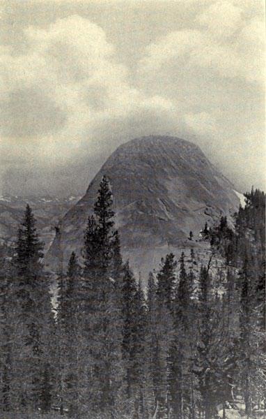 One of the best general views of the middle region of the park is to be had from the top of a majestic dome which long ago I named the Glacier Monument. It is situated a few miles to the north of Cathedral Peak, and rises to a height of about fifteen hundred feet above its base and ten thousand above the sea. At first sight it seems sternly inaccessible, but a good climber will find that it may be scaled on the south side. Approaching it from this side you pass through a dense bryanthus-fringed grove of mountain hemlock, catching glimpses now and then of the colossal dome towering to an immense height above the dark evergreens; and when at last you have made your way across woods, wading through azalea and ledum thickets, you step abruptly out of the tree shadows and mossy leafy softness upon a bare porphyry pavement, and behold the dome unveiled in all its grandeur. Fancy a nicely proportioned monument, eight or ten feet high, hewn from one stone, standing in a pleasure ground; magnify it to a height of fifteen hundred feet, retaining its simplicity of form and fineness, and cover its surface with crystals; then you may gain an idea of the sublimity and beauty of this ice-burnished dome, one of many adorning this wonderful park.