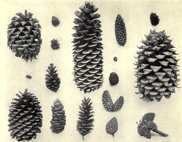 Pinus attenuata is a small, slender, arrowy tree, with pale green leaves in threes, clustered flowers half an inch long, brownish yellow and crimson, and cones whorled in conspicuous clusters around the branches and also around the trunk. The cones never fall off or open until the tree dies. They are about four inches long, exceedingly strong and solid, and varnished with hard resin forming a waterproof and almost worm and squirrel proof package, in which the seeds are kept fresh and safe during the lifetime of the tree. Sometimes one of the trunk cones is overgrown and imbedded in the heart wood like a knot, but nearly all are pushed out and kept on the surface by the pressure of the successive layers of wood against the base.