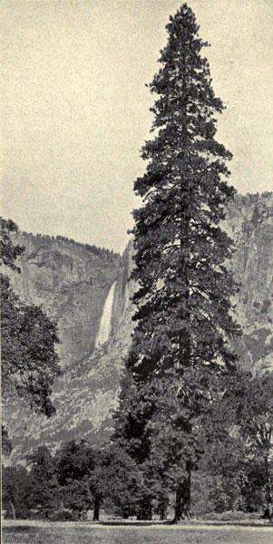 The incense cedar (Libocedrus decurrens), when full grown, is a magnificent tree, one hundred and twenty to nearly two hundred feet high, five to eight and occasionally twelve feet in diameter, with cinnamon-colored bark and warm yellow-green foliage, and in general appearance like an arbor vitæ. It is distributed through the main forest from an elevation of three to six thousand feet, and in sheltered portions of cañons on the warm sides to seven thousand five hundred. In midwinter, when most trees are asleep, it puts forth its flowers. The pistillate are pale green and inconspicuous; but the staminate are yellow, about one fourth of an inch long, and are produced in myriads, tingeing all the branches with gold, and making the tree as it stands in the snow look like a gigantic goldenrod. Though scattered rather sparsely amongst its companions in the open woods, it is seldom out of sight, and its bright brown shafts and warm masses of plumy foliage make a striking feature of the landscape. While young and growing fast in an open situation no other tree of its size in the park forms so exactly tapered a pyramid. The branches, outspread in flat plumes and beautifully fronded, sweep gracefully downward and outward, except those near the top, which aspire; the lowest droop to the ground, overlapping one another, shedding off rain and snow, and making fine tents for storm-bound mountaineers and birds. In old age it becomes irregular and picturesque, mostly from accidents: running fires, heavy wet snow breaking the branches, lightning shattering the top, compelling it to try to make new summits out of side branches, etc. Still it frequently lives more than a thousand years, invincibly beautiful, and worthy its place beside the Douglas spruce and the great pines.