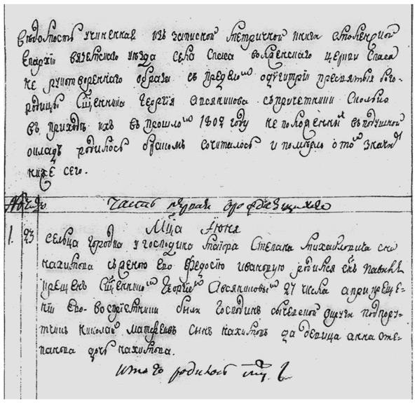 Запись в метрической книге о рождении и крещении П. С. Нахимова. Государственный архив Смоленской области