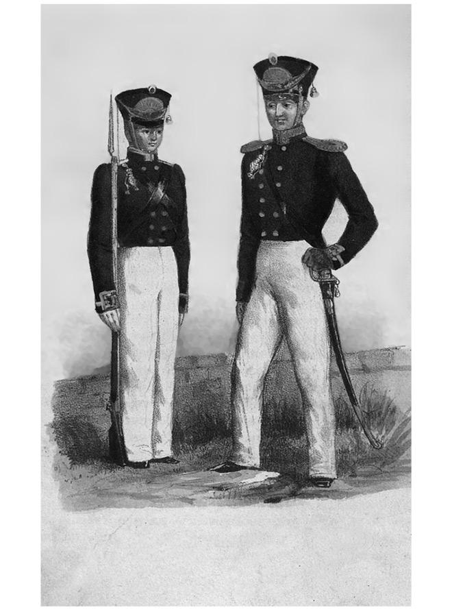 Кадет и обер офицер Морского кадетского корпуса в 1812 году. Литография В. А. Прохорова. 1852 г.
