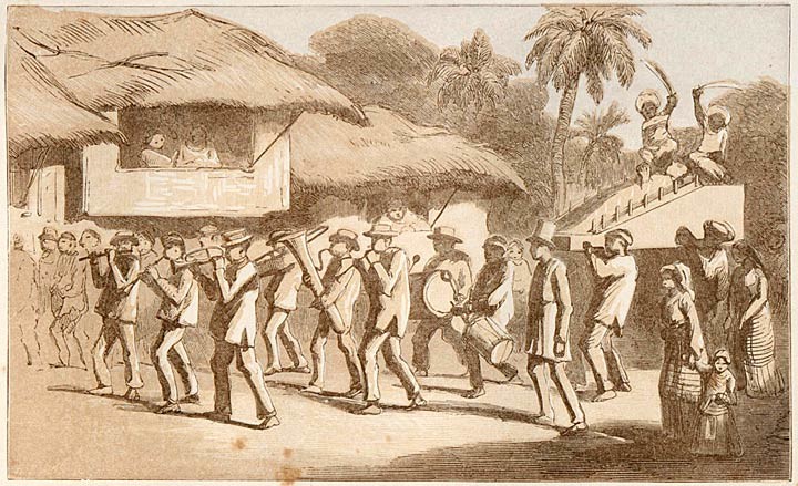 The popular amusement is dancing; they form themselves into a circle, stretching out their hands, using their feet alternately, leaping on one and lifting the other behind; so they move round and round with loud cries to the sounds of cylindrical drums struck by both hands.