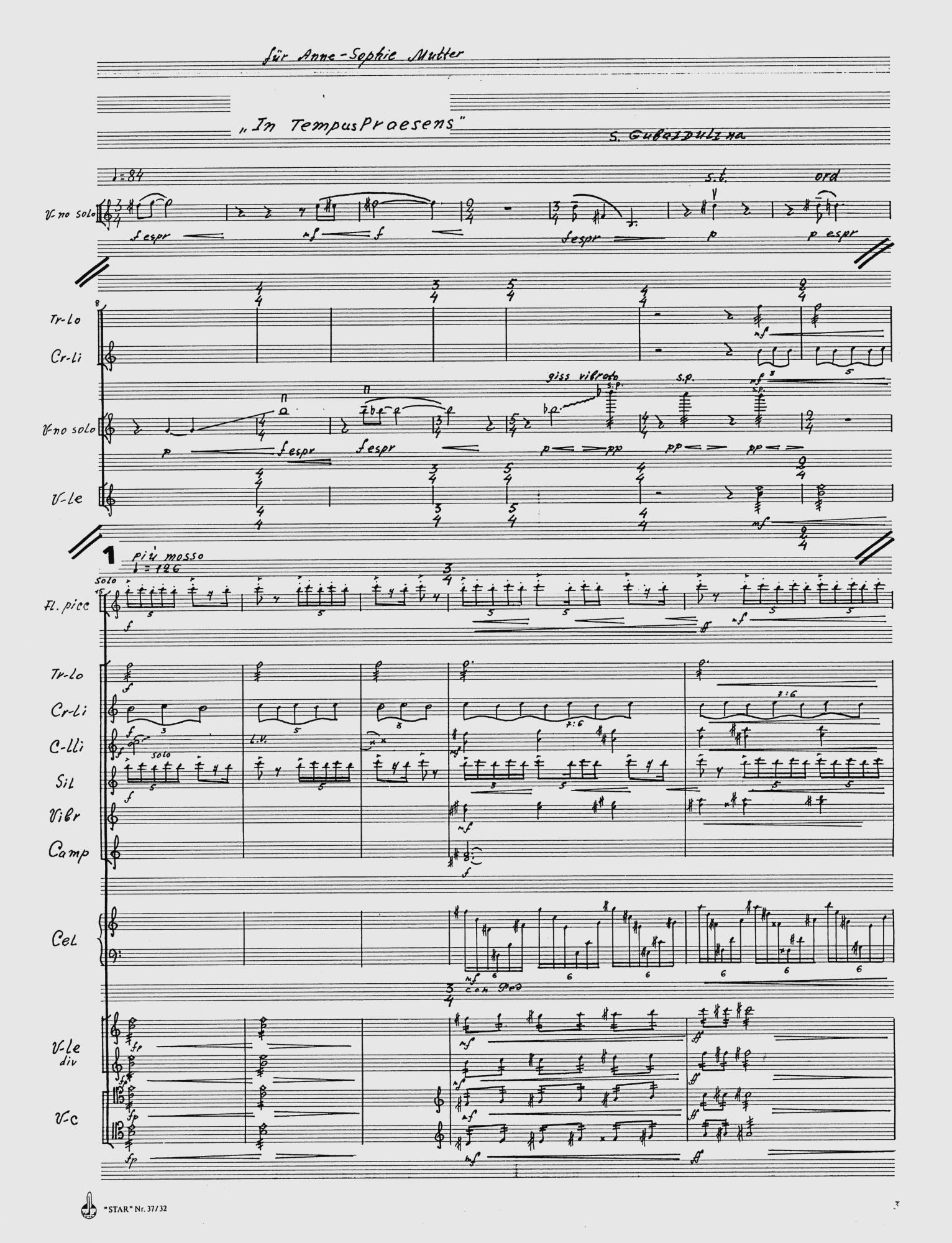 Фрагмент партитуры «In tempus praesens», второго концерта для скрипки с оркестром (2007).