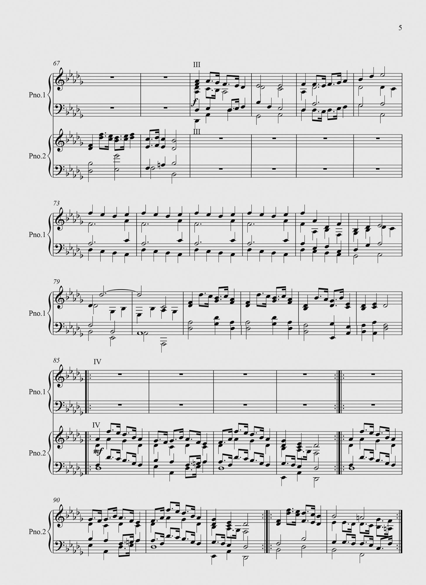 На протяжении многих лет старые друзья, живущие в разных городах, а после распада СССР — и в разных странах, обменивались в письмах короткими фортепианными пьесами. Цикл, созданный по переписке, был начат в 1984 году с письма Георга Пелециса. В 2002-м цикл был исполнен авторами в концертном зале им. Чайковского, записан и издан на компакт-диске. На этой странице фрагмент III принадлежит Георгу Пелецису, фрагмент IV — Владимиру Мартынову.