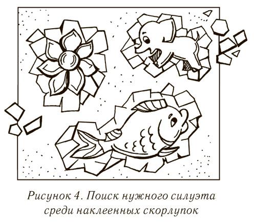 Силуэт каждой наклеенной на бумагу скорлупки своеобразен, он способен дать значительный толчок воображению художника. В такой силуэт можно вписать контуры человеческих фигур, различных животных, зданий, машин, растений, цветов и многое другое (рис. 4).
