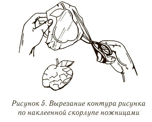 Найденный на скорлупе контур нужного изображения надо обрисовать со стороны папиросной бумаги. Затем аккуратно обрезать ножницами скорлупу вокруг силуэта. Мелкие детали в процессе вырезания контура прорабатывать не обязательно. Скорлупу можно достаточно легко резать ножницами по прямым и кривым линиям, но только с внешней стороны (рис. 5).
