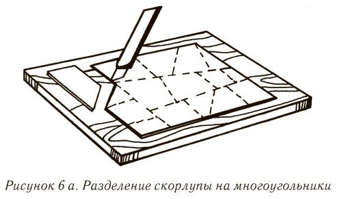 Все работы при использовании этой техники следует выполнять на отдельных дощечках, которые играют роль подложки — основы мозаичного набора. Подготовленную (наклеенную на бумагу) скорлупу сначала следует разрезать на многоугольники с прямыми сторонами и по возможности прямыми углами (рис. 6 а).