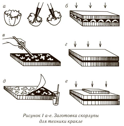 При этой операции отдельные куски скорлупы раздробятся на более мелкие части. Однако они будут плотно прилегать к бумаге. Затем снова нужно наложить сверху дощечку и придавить набор тяжелым грузом (рис. 1 г).