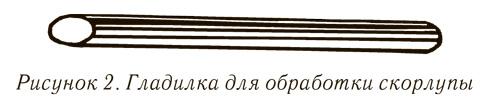 Гладилку для обработки скорлупы можно сделать в виде стержня из твердого дерева. Косой срез стержня нужно отполировать до блеска (рис. 2).