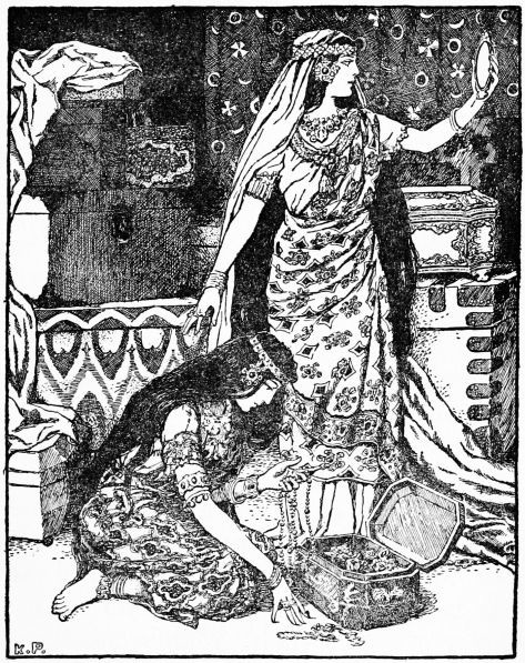 At last after he had journeyed over seven mountains, and over seven seas, he came to a palace that stood beside a lake, and in this palace lived an enchantress queen and her daughter. He knocked at the door and when the queen came to see who was there he once more asked whether she could tell him anything of the seven golden peahens who were the daughters of a king.
