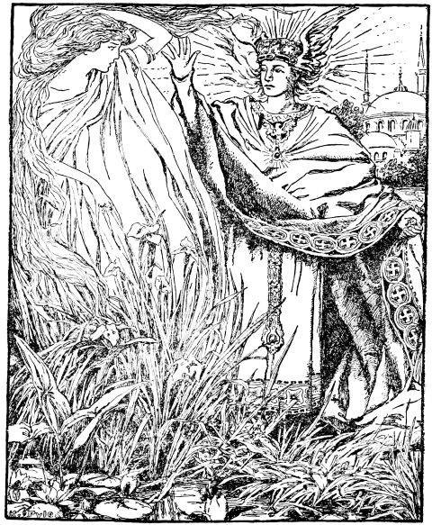 Presently there was a light in the sky and the seven golden peahens came flying and alighted upon the borders of the lake. Six of them began to bathe themselves in its waters but the seventh one changed into a princess. She came over to the prince and began to call to him and caress him, but she could not awaken him from his sleep.
