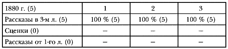 Доля рассказов от 1-го лица до 1886 года неуклонно снижалась. В 1882 году они составили 36 % общего числа произведений, в 1883-м – 17, в 1884-м – 11, в 1885-м – только 9 %. (Хотелось бы поставить этот процесс в зависимость от общей тенденции к объективному повествованию.)