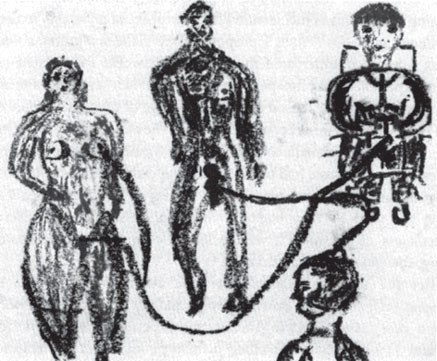 Однако изобразительный процесс оказался для меня очень трудным, и мне было тяжело принять то, что в результате него получилось (рисунок 3). Сейчас я лучше понимаю желание клиентов уничтожить свои работы. Но рисование все же принесло мне определенное облегчение. Хотя я чаще создаю абстрактные образы, на сей раз рисунок был реалистичным: я попыталась изобразить преследующие меня неприятные фантазии. Я нарисовала себя держащей на коленях электрическую батарею, готовой нажать на кнопку. Батарея соединялась проводами с теми или иными частями тела обнаженных жертв: соском и промежностью Анни, гениталиями Тома и головой Роберта (этот клиент часто жаловался на головные боли, которые были связаны с тем, что, когда он находился в тюрьме, его постоянно били по голове).
