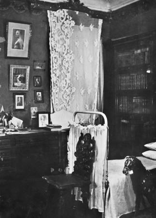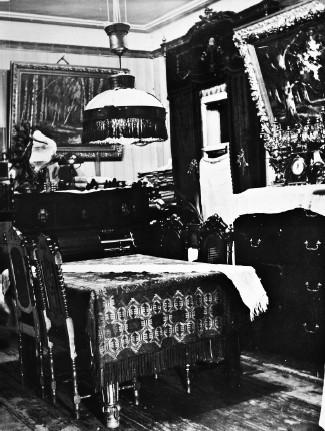 Из прихожей дверь вела в две смежные комнаты, первая из которых служила столовой, а вторая – спальней и детской. Так было в последние годы перед войной. Сохранились фотографии с интерьерами этих комнат. Мебель была в основном резная дубовая. Было несколько картин в золоченых рамах, золоченые карнизы и тяжелые портьеры на окнах и дверях, старинное пианино с подсвечниками, туалетный столик и трельяж, большое трюмо, столовое серебро, фарфор, бронза.
