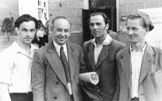 К.А. Кордобовский (второй слева) у Театрального музея среди своих учеников, июнь 1950 г. Из семейного архива В.А. Смирнова