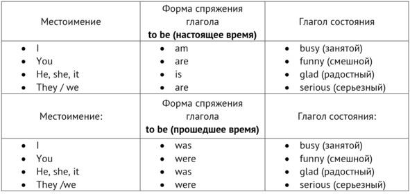 В таблице ниже приводятся различные формы глагола to be (в настоящем и прошедшем времени) для разных местоимений: