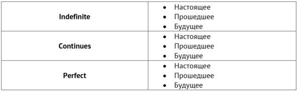 В рамках каждой из групп времен Indefinite, Continues, Perfect есть свое настоящее, прошедшее и будущее время. Таким образом, для обозначения времени действия в английском предложении в отличие от трех русских времен (настоящее прошедшее и будущее) используется девять времен: