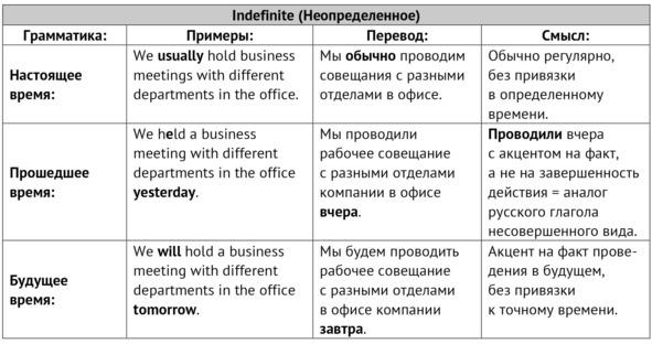 • Действие происходит во времени регулярно, постоянно (за описание такого действия отвечает группа времен Indefinite или неопределенное);
